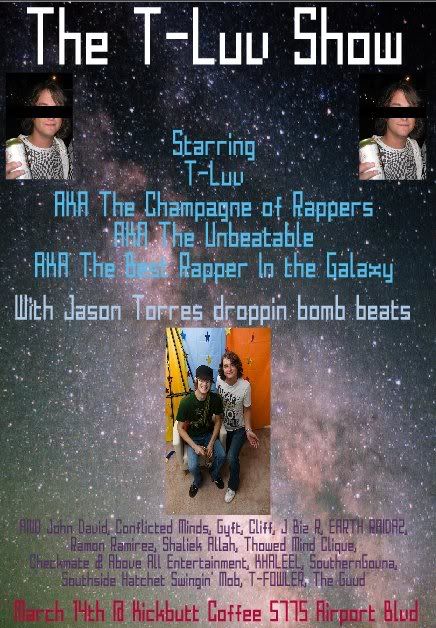 We have been some busy bees. We have been gettin ready for this show tomorrow (March 14th) and we did a house party last week. We are also about to drop another mixtape. It's pretty much done. Jason's going down to the valley and he's gonna edit and we'll see how it stands when he gets back. Here's the flyer for the showw
